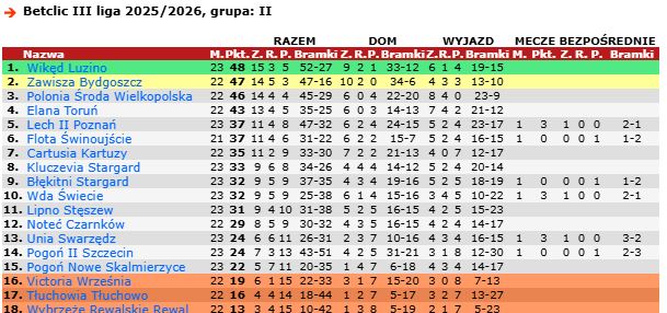 Luziński zespół z dorobkiem 48 punktów lideruje tabeli, ale ma jeden mecz rozegrany więcej niż drugi Zawisza Bydgoszcz i trzecia Polonia Środa Wielkopolska. Nad tymi zespołami Wikęd ma odpowiednio jeden i dwa "oczka" przewagi.