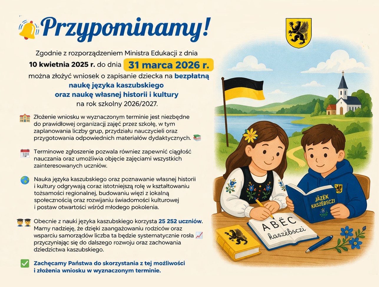 Rodzice mają czas tylko do 31 marca, aby złożyć wniosek o zapisanie dziecka na bezpłatną naukę języka kaszubskiego oraz zajęcia związane z poznawaniem historii i kultury regionu w roku szkolnym 2026/2027.