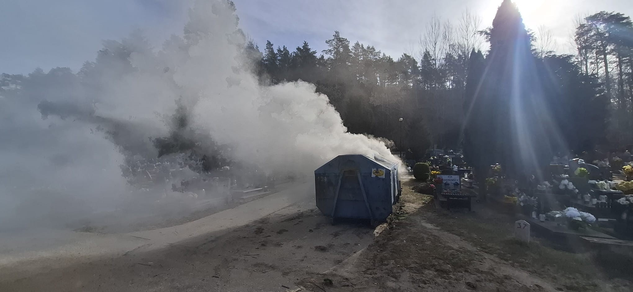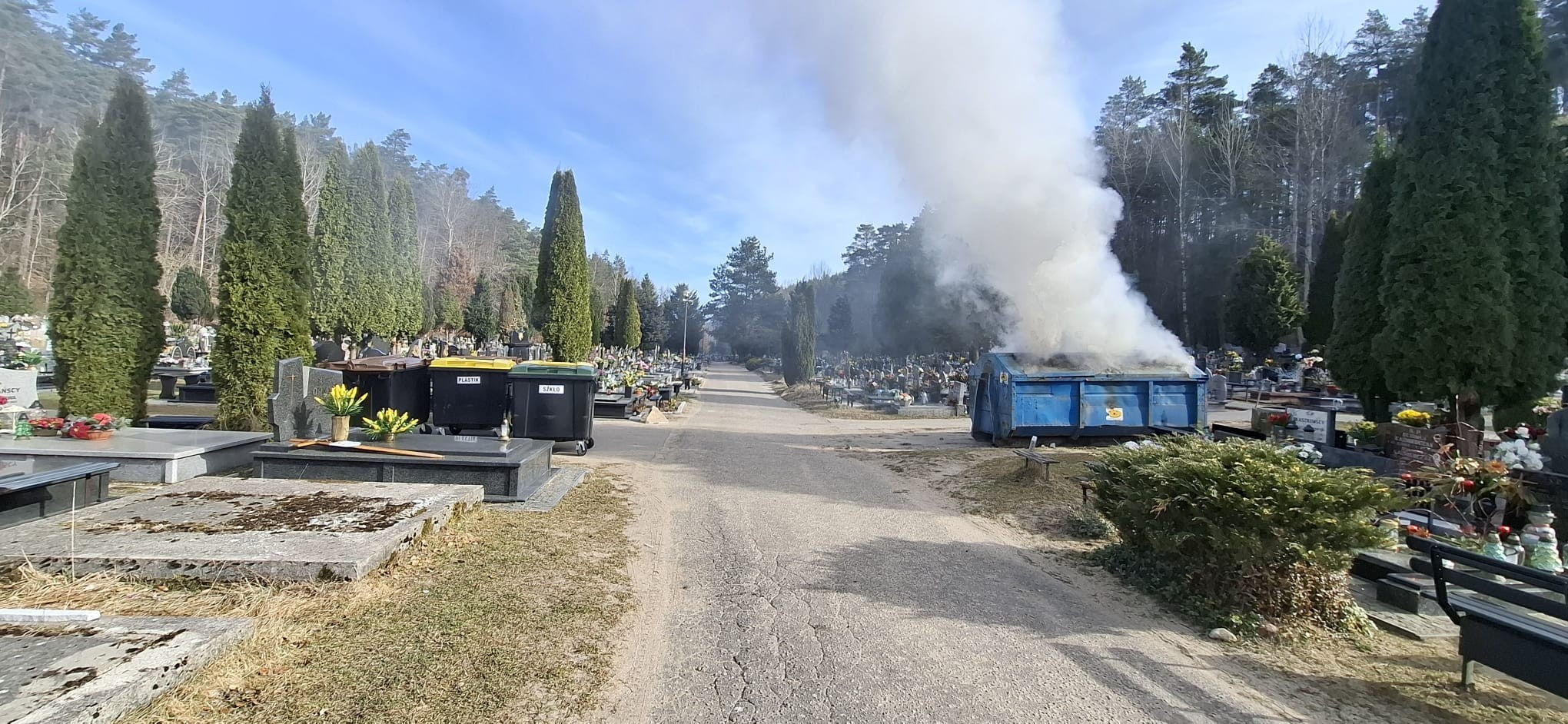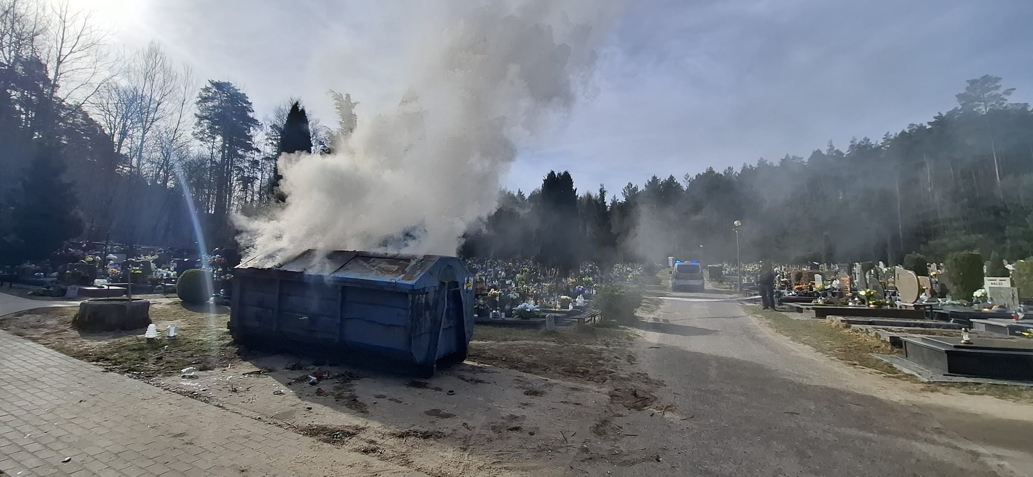 W sobotę, 28 marca, około godziny 8:25 Straż Miejska w Wejherowo otrzymała zgłoszenie o pożarze śmieci w kontenerze znajdującym się na cmentarzu przy ulicy księdza Roszczynialskiego. Osoba zgłaszająca poinformowała, że ogień prawdopodobnie udałoby się ugasić butelką wody, jednak na terenie nekropolii woda była w tym czasie wyłączona.