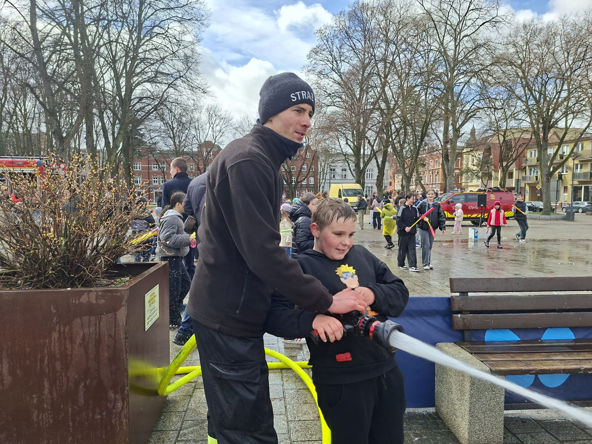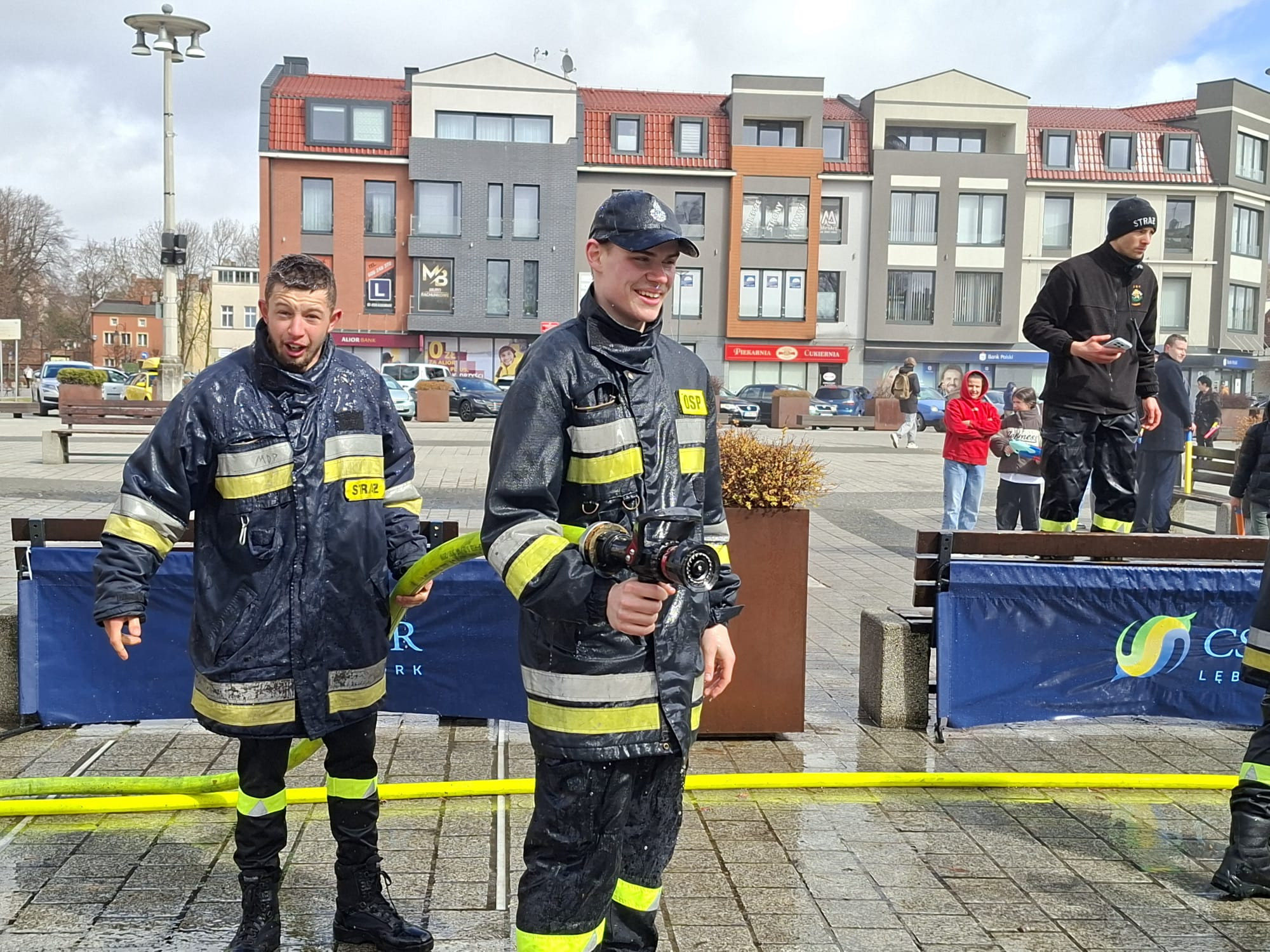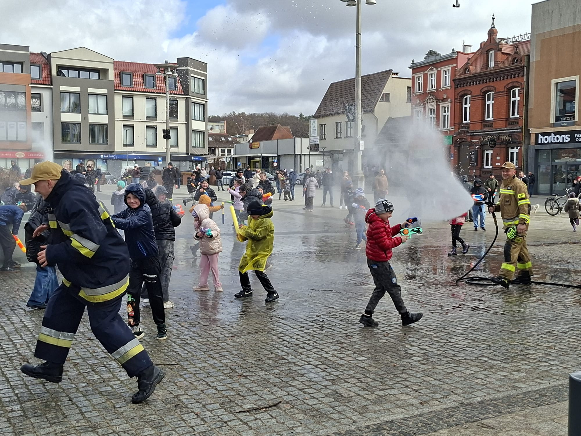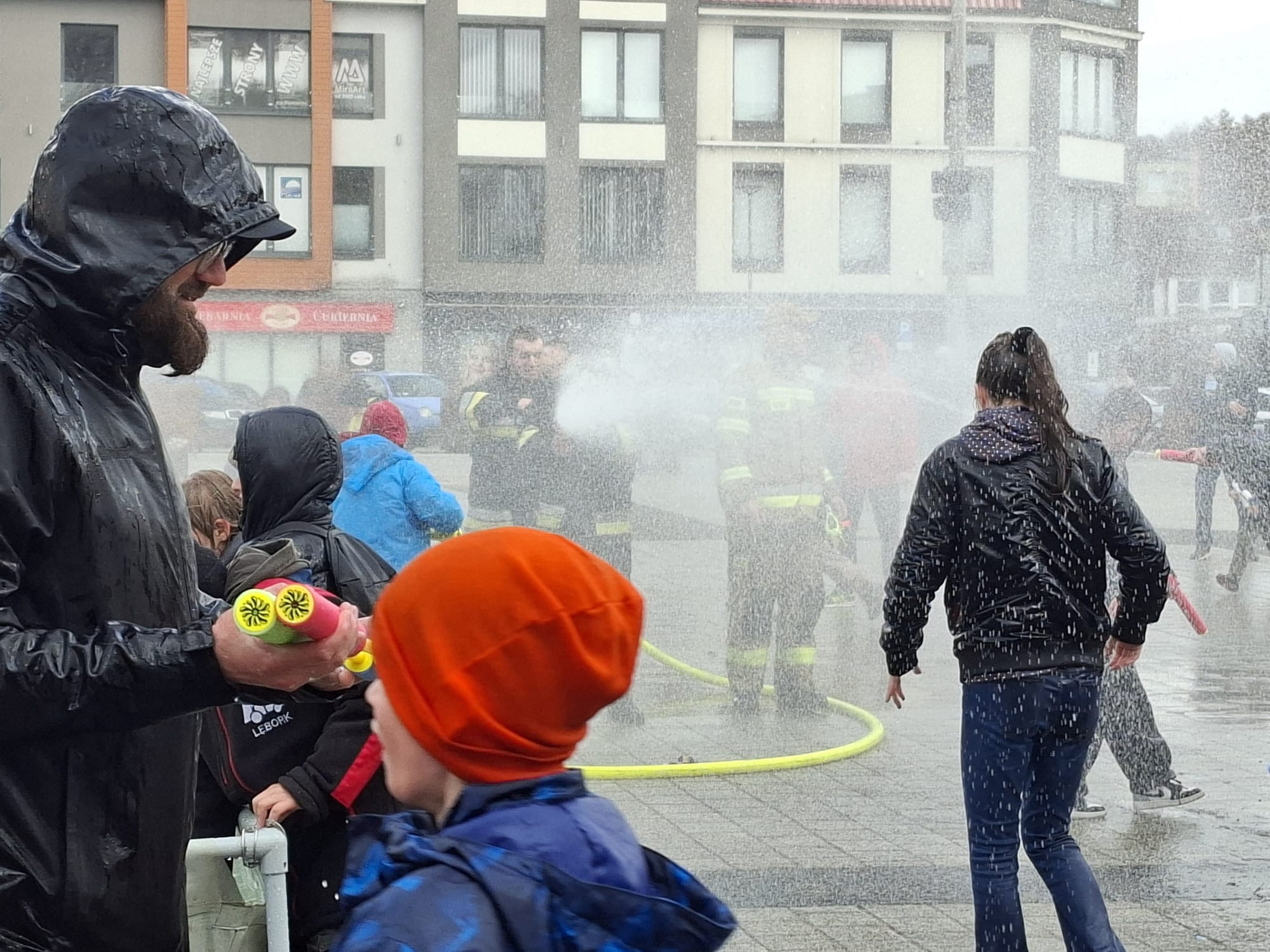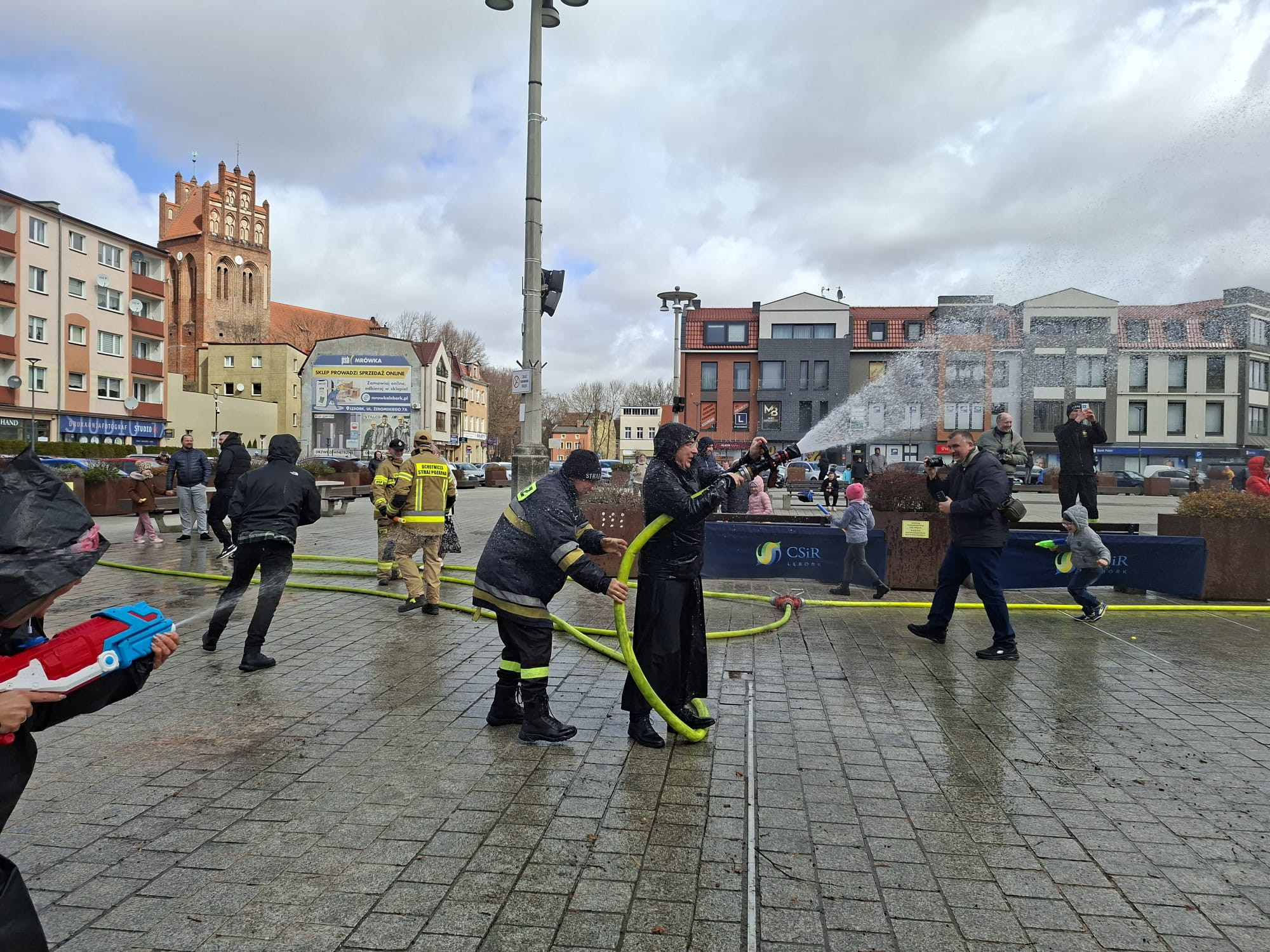 Do zabawy włączył się również burmistrz Lęborka Jarosław Litwin. O zapasy wody i bezpieczeństwo zadbali strażacy z OSP Lębork.