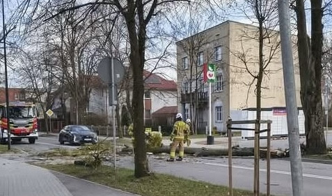 Drzewo runęło na ulicę Sobieskiego w Wejherowie. Droga jest zablokowana. Na miejscu pracują strażacy.