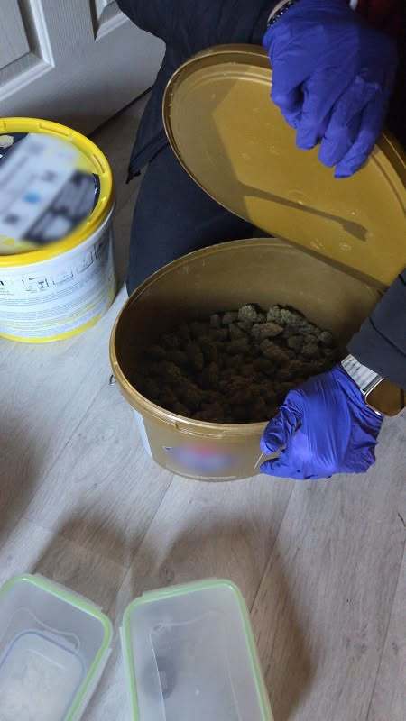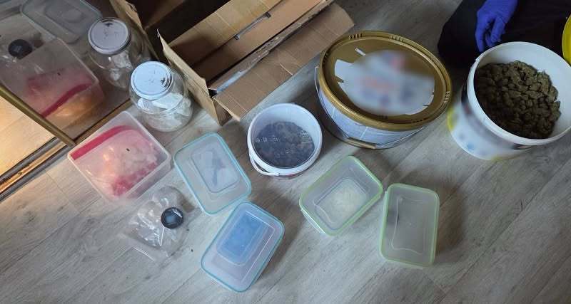 To właśnie w jednym z tych schowków policjanci natrafili na prawdziwy magazyn. Znaleźli tam zgrzewarkę oraz pojemniki, wiadra i słoiki wypełnione różnego rodzaju substancjami. Wśród zabezpieczonych narkotyków były m.in. marihuana, kokaina, amfetamina, MDMA oraz nowe substancje psychoaktywne, takie jak 3-CMC i 2-CMC. Policjanci zabezpieczyli susz roślinny, biały proszek, kryształki oraz ponad 280 tabletek.