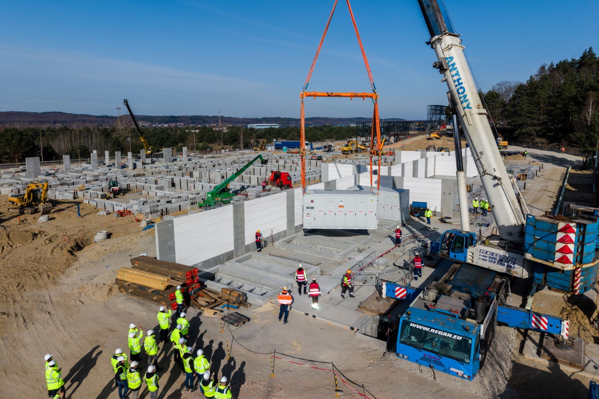 W Żarnowcu rozpoczął się etap dostaw oraz montażu kluczowych elementów Magazynu Energii Elektrycznej. Na teren inwestycji trafiają pierwsze jednostki kontenerowego systemu magazynowania energii DC-Link, które są od razu instalowane w miejscach docelowych – na specjalnie przygotowanych płytach fundamentowych. Wszystkie jednostki zostały wyprodukowane w Polsce.