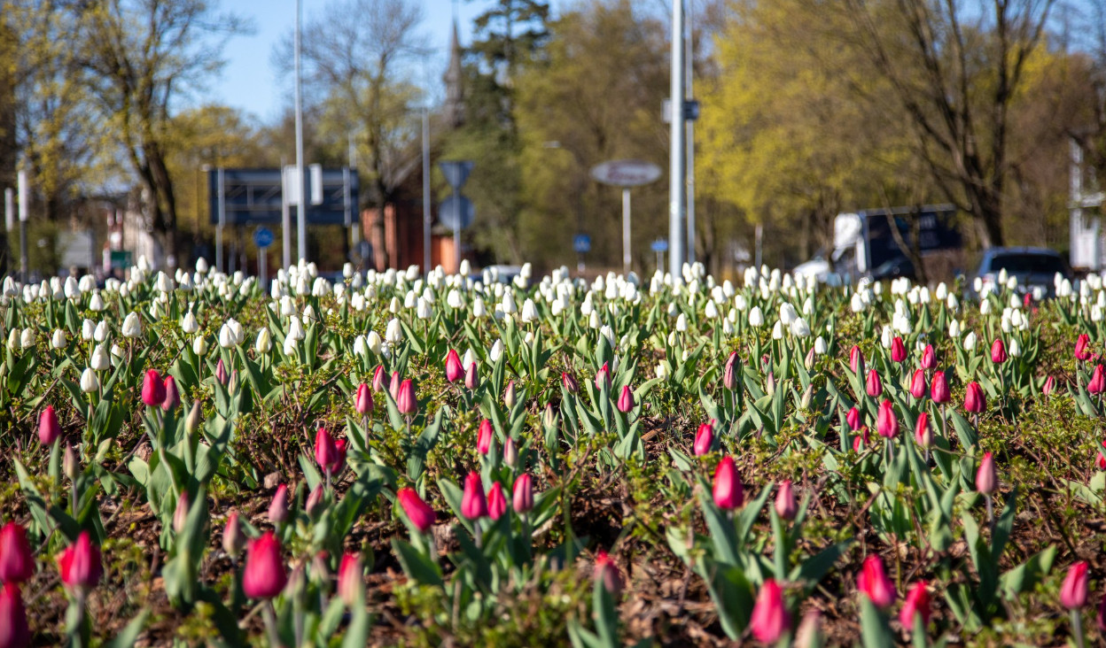 Na Rondzie Solidarności w Lęborku można już podziwiać wyjątkową, wiosenną aranżację. Biało-czerwone tulipany zaczynają kwitnąć, tworząc efektowną kompozycję w centralnym punkcie miasta. Rośliny z dnia na dzień rozwijają się coraz bardziej, a pełnię swojego uroku osiągną w okolicach Święta Konstytucji 3 Maja.