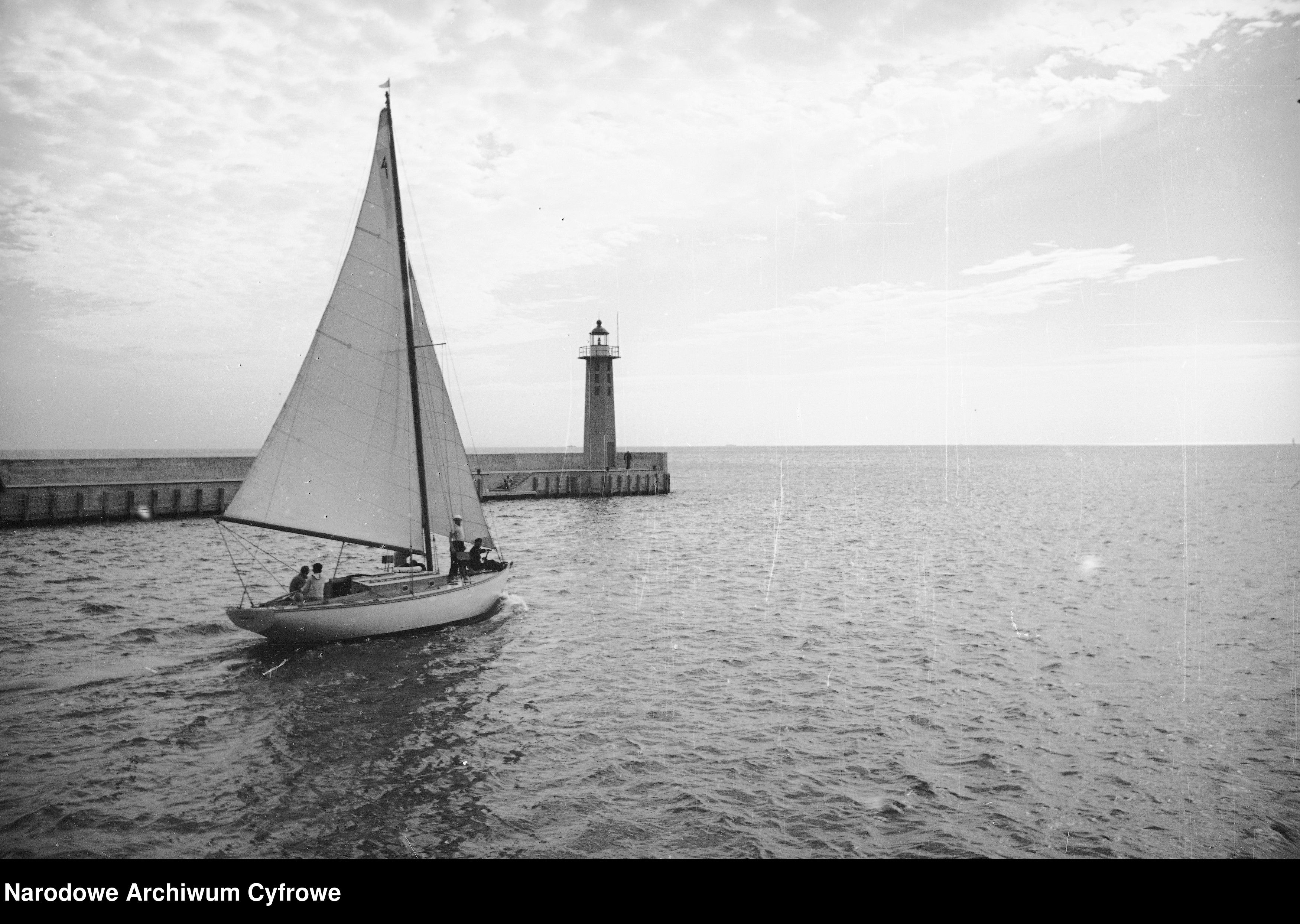 Widok na morze. Widoczna żaglówka w porcie rybackim. 1938  fot. Narodowe Archiwum Cyfrowe