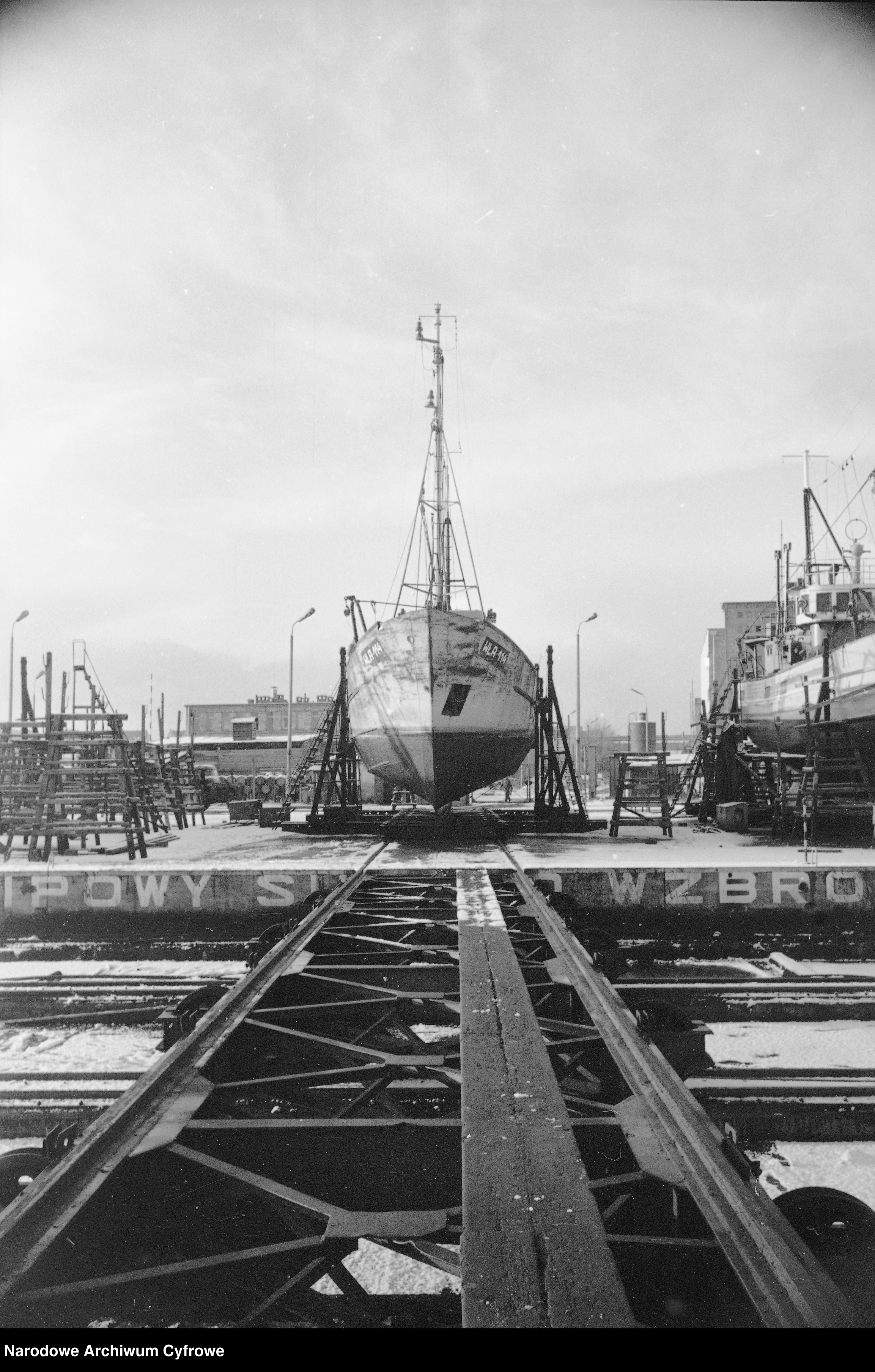 Remontowany kuter rybacki WŁA-114 na pochylni. 1969  fot. Narodowe Archiwum Cyfrowe