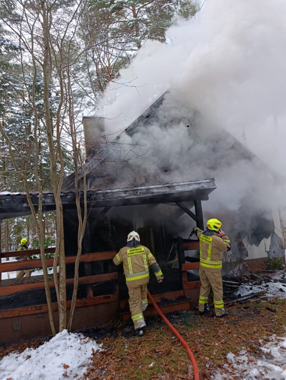Pożar domku letniskowego w Dębkach. Z ogniem walczy pięć zastępów