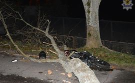 Motocyklista uderzył w leżące na jezdni drzewo, które przewrócił wiatr. 25-latek został przetransportowany do szpitala.