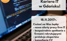 W sobotę 18 listopada w Hotelu Almond w Gdańsku, który mieści się przy ulicy Toruńskiej 12, odbędzie się kolejne spotkanie dla branży informatycznej "Kariera IT". Udział w targach jest bezpłatny. Wydarzenie skierowane jest do specjalistów IT, programistów, testerów oraz studentów ostatnich lat kierunków informatycznych. Na uczestników czekają: prelekcje merytoryczne, prezentacje najlepszych ofert pracy oraz pokazy nowinek technologicznych.