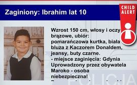 W systemie Child Alert opublikowano komunikat o poszukiwaniu 10-letniego Ibrahima z Gdyni. Chłopiec miał być uprowadzony przez Marokańczyka, który, jak podają przedstawiciele służb, może być niebezpieczny. Każdy, kto ma informacje o losie dziecka, proszony jest o niezwłoczny kontakt z numerem telefonu 995.