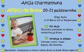 Akcja charytatywna „Apiko dla Bruna” odbędzie się 20 i 21 października przy ul. 12 Marca 211 w Wejherowie. Podczas wydarzenia będą zbierane pieniądze na rehabilitację chłopca, który cierpi na nieuleczalną chorobę.