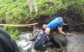 Chciał się napić wody, ale wpadł do rowu i utknął. Strażacy – ochotnicy uratowali od śmierci wycieńczonego, młodego konia.