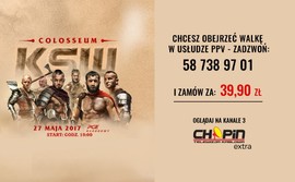 W sobotę (27 maja) Telewizja Kablowa Chopin poprowadzi transmisję z 39 gali KSW. W TK Chopin można zakupić tę usługę w systemie PPV. Podczas 39. gali KSW: Colosseum zobaczymy pierwszy w historii KSW pojedynek dwóch czempionów Mameda Khalidova z Borysem Mańkowskim, ale także starcia Mariusza Pudzianowskiego z Tyberiuszem Kowalczykiem, Marcina Różalskiego, którego przeciwnikiem będzie Fernando Rodriguesa Jr, a Popek Monster powróci do klatki, by skrzyżować rękawice z niepokonanym w MMA, niezwykle popularnym kulturystą, Robertem Burneiką.