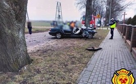 Na prostym odcinku drogi czołowo zderzyły się dwa pojazdy osobowe. Wskutek uderzenia hyundai wbił się w drzewo, a 23-letni kierowca został ranny. Mężczyzna został przetransportowany śmigłowcem LPR do szpitala.