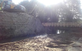 Trwa remont mostu w Dąbrówce Młyn (gmina Luzino). Obecnie konstrukcja została całkowicie zdemontowana, a na drugą stronę rzeki można przejść tylko dzięki wybudowanej wcześniej kładce dla pieszych.