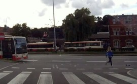 Dziewczynka jedzie na deskorolce, nagle traci równowagę, a deskorolka wtacza się na ruchliwą ulicę. Dziecko biegnie za nią i prawie wpada pod nadjeżdżający autobus. Do niebezpiecznej sytuacji doszło na ulicy Podwale Grodzkie w Gdańsku.
