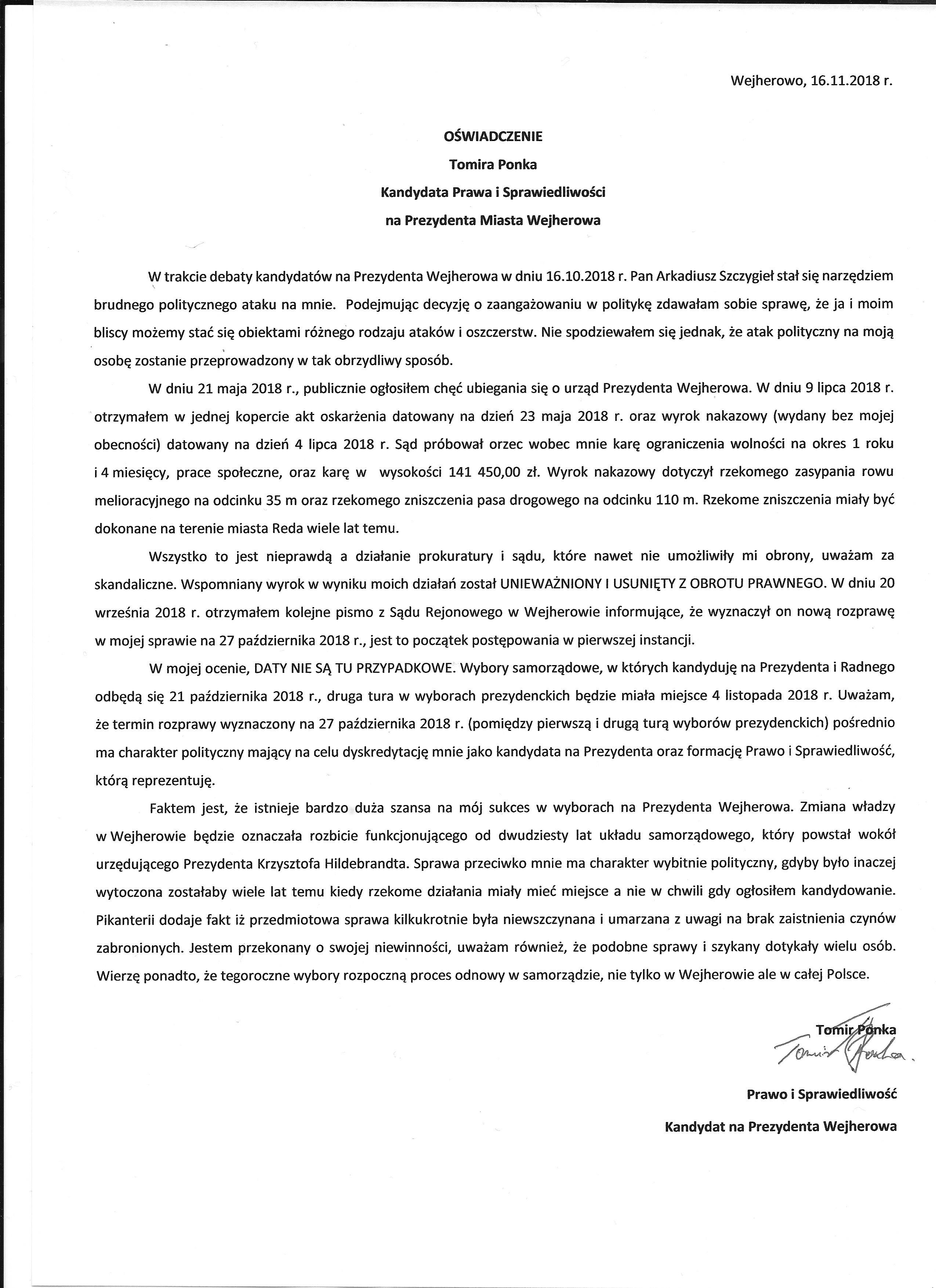 – Wybory samorządowe, w których kandyduję na prezydenta i radnego odbędą się 21 października 2018 r., druga tura w wyborach prezydenckich będzie miała miejsce 4 listopada 2018 r. Uważam, że termin rozprawy wyznaczony na 27 października 2018 r. (pomiędzy pierwszą i drugą turą wyborów prezydenckich) pośrednio ma charakter polityczny mający na celu dyskredytację mnie jako kandydata na prezydenta oraz formację Prawo i Sprawiedliwość, którą reprezentuję – zaznacza Tomir Ponka.