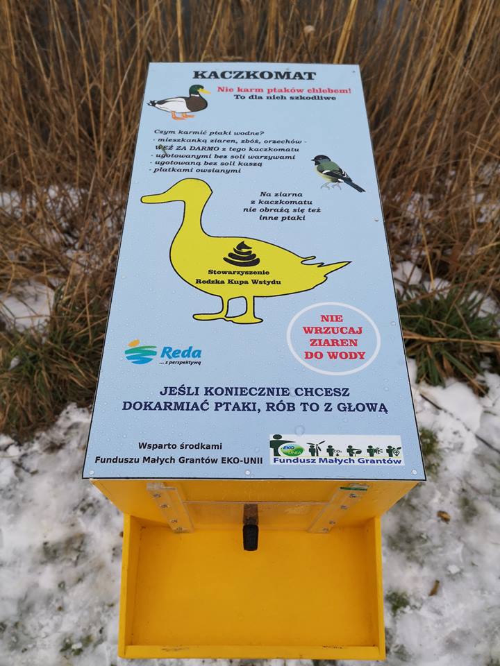 Dokarmiając ptaki zimą, warto pamiętać, że najlepszą formą jest podawanie im mieszanki ziaren. Od poniedziałku (28 stycznia) spacerowicze, którzy wybiorą się do Parku Miejskiej w Redzie, będą mogli zadbać właśnie w taki sposób o ptasią dietę. A służą temu dwa „kaczkomaty” – za mostkiem w kierunku Ciechocina oraz w okolicach przystani kajakowej.