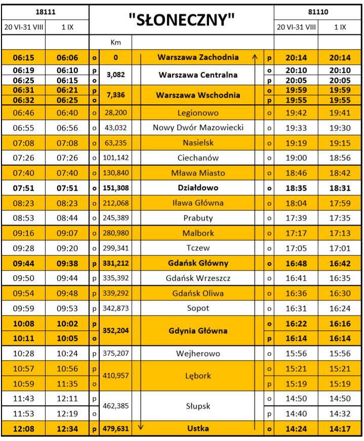 Pociąg będzie wyruszał z Warszawy Zachodniej o godzinie 6:15. Do Gdańska dotrze o godzinie 9:44. W Wejherowie skład zatrzyma się o godzinie 10:28, a do Ustki dotrze o 12:08. W drogę powrotną „Słoneczny” wyruszy o godzinie 14:24.