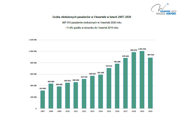 Przez ostatnie lata informowaliśmy o regularnych wzrostach liczby podróżnych na gdańskim lotnisku i kolejnych rekordowych wynikach finansowych. Kryzys spowodowany pandemią koronawirusa negatywnie odbija się na całej branży lotniczej w skali globalnej. Pod tym względem Port Lotniczy Gdańsk nie jest wyjątkiem. O ile w styczniu liczba pasażerów, którzy zostali obsłużeni w Gdańsku, wzrosła o 17,4%, w porównaniu z 2019 rokiem, a w lutym – zwiększyła się o 14,3%, w marcu spadła niemal o 60% (59,8%). Łącznie w całym I kwartale 2020 roku z gdańskiego lotniska skorzystało 887 010 podróżnych, podczas gdy w 2019 roku było ich już ponad milion.