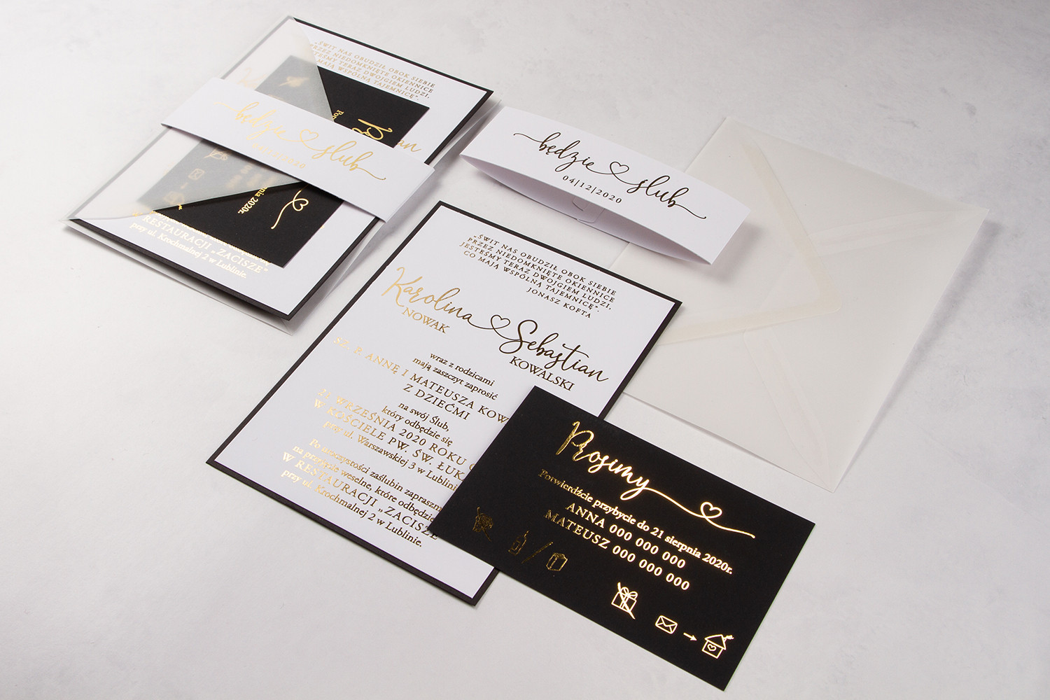 Natomiast zaproszenia ślubne jednokartkowe nie mają strony tytułowej zapraszającej do otwarcia, a treść zaproszenia umieszczona jest na jednej stronie. Jak zmieścić wszystkie potrzebne informacje na jednej stronie? W kopercie z zaproszeniem znajduje się jeszcze RVSP, czyli kartka z numerami telefonu, by móc potwierdzić swoje przybycie. Obie kartki są elegancko ozdobione i posiadają ten sam design, a rozmiar czcionki niczym się nie różni od tej umieszczonej na zaproszeniu otwieranym.