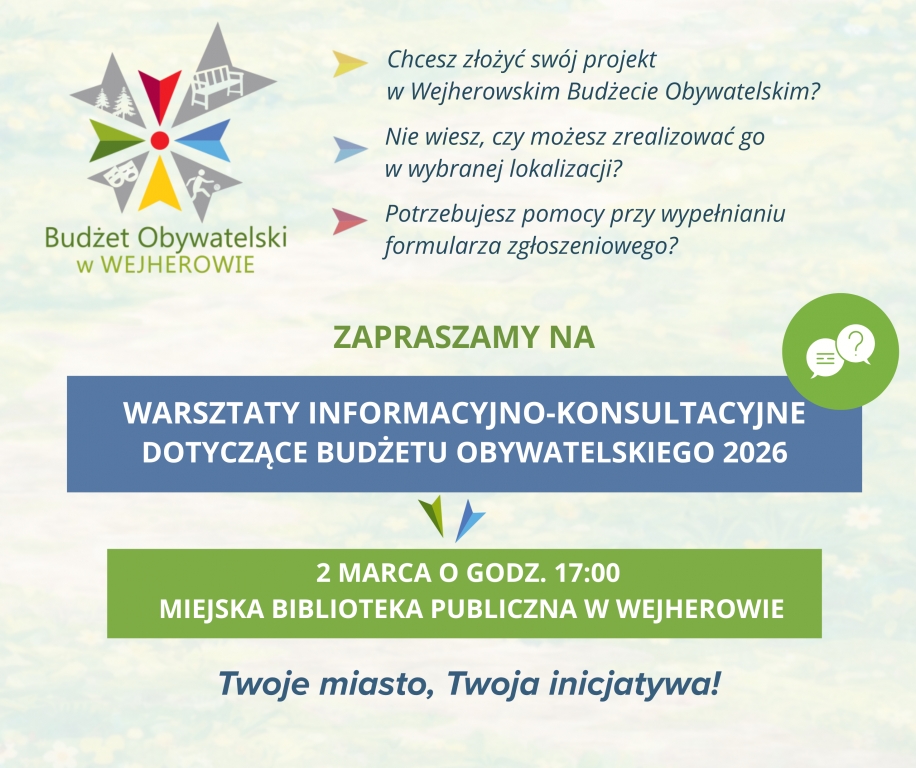 2 marca o godzinie 17:00 w Miejskiej Bibliotece Publicznej w Wejherowie odbędą się warsztaty informacyjno-konsultacyjne poświęcone tegorocznej edycji wejherowskiego Budżetu Obywatelskiego.